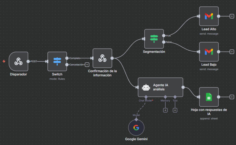 El sistema analiza automáticamente cada registro y determina si la persona tiene un potencial alto o bajo en función de su inversión ideal. Cuando se identifica un lead de alto potencial, se le envía un correo personalizado invitándolo a agendar una llamada estratégica. En cambio, si el lead muestra un potencial más bajo, recibe un email de agradecimiento junto con acceso gratuito a una masterclass.