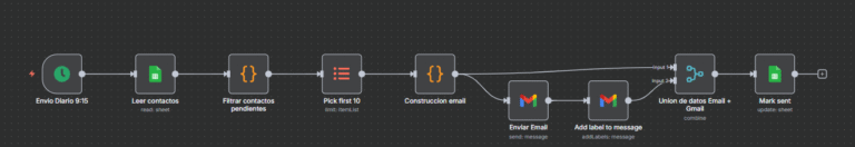 Antes de enviar nada, la automatización filtra los contactos para asegurarse de que solo se escriba a quienes todavía no han recibido el correo. Esto evita duplicados y mantiene limpia la base de datos. Además, se limita el número máximo de correos por día a 100, para que los envíos sean progresivos y controlados.