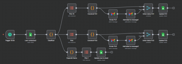 El sistema realiza un seguimiento inteligente de los contactos. Si alguien no responde, se envía un primer recordatorio a los 2 días y un segundo a los 5 días, ambos con mensajes distintos y adaptados al contexto. Todos los envíos y sus fechas se registran automáticamente en la hoja de cálculo, actualizando el estado de cada contacto.