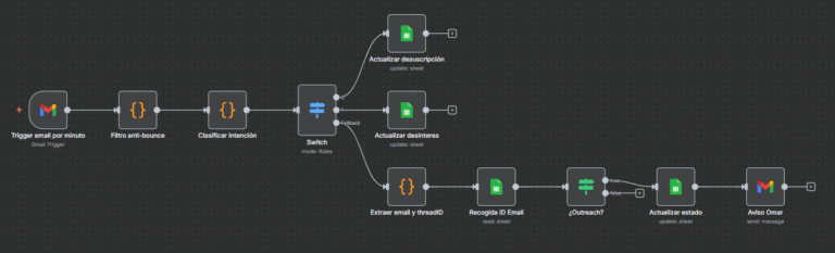 La automatización monitorea Gmail cada minuto para detectar respuestas. Si alguien contesta, se marca como “replied”; si pide la baja o muestra desinterés, el sistema actualiza su estado y detiene los envíos futuros. Además, se genera una página de confirmación de baja y se notifica a Omar sobre cualquier respuesta o desuscripción.