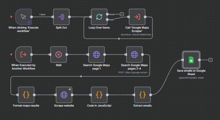 Una vez localizados los negocios, la automatización extrae los datos más importantes de cada uno: nombre, dirección, teléfono, página web, tipo de negocio y valoración en Google. Después, visita automáticamente las páginas web encontradas para buscar correos electrónicos de contacto, aplicando filtros inteligentes que eliminan los correos falsos, genéricos o repetidos (como los de Gmail, Yahoo o dominios sin relevancia). Así se obtiene una lista limpia, precisa y útil de posibles contactos reales de cada empresa.